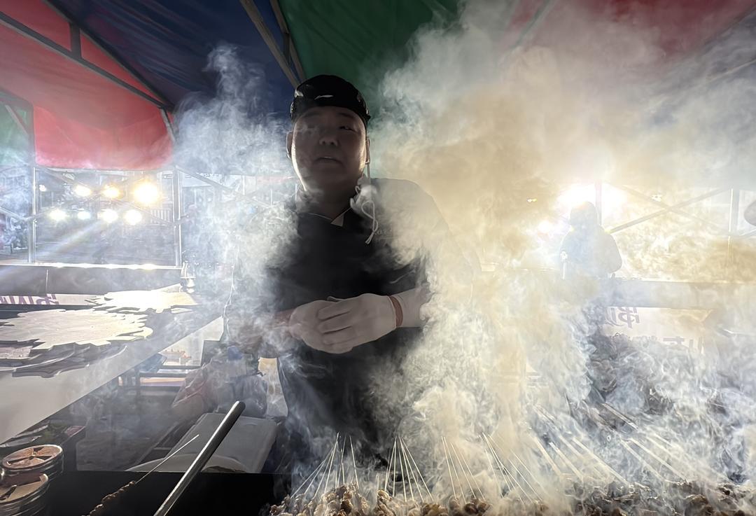 代表枣庄比赛的滕州大壮烧烤一直在为观众制作肉串。