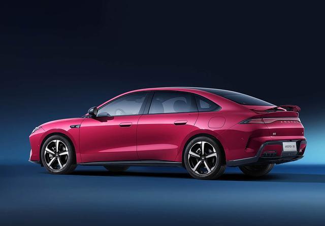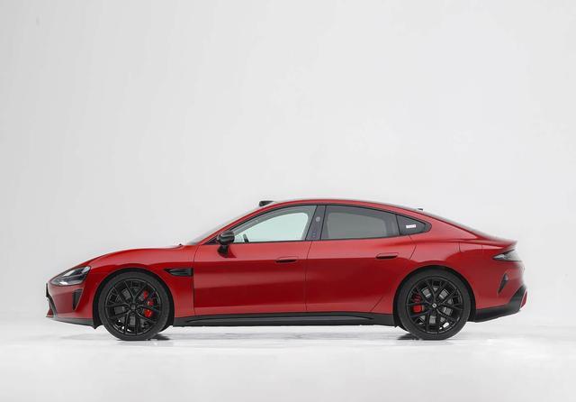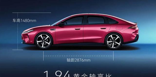侧面的看点也不少,笔者觉得有点像小米SU7,尤其是后部的感觉,笔者也放一张小米SU7的图片供大家对比。细节方面,新车采用了半隐藏式门把手的设计,同时针对车窗边缘饰条进行了黑化处理,搭配五辐式轮圈,整体设计感不错。具体尺寸上,新车的长宽高分别为4916/1900/1480mm,轴距为2876mm。